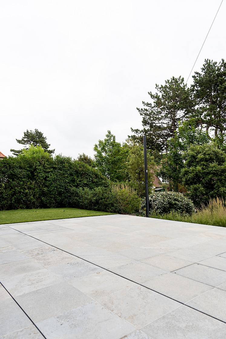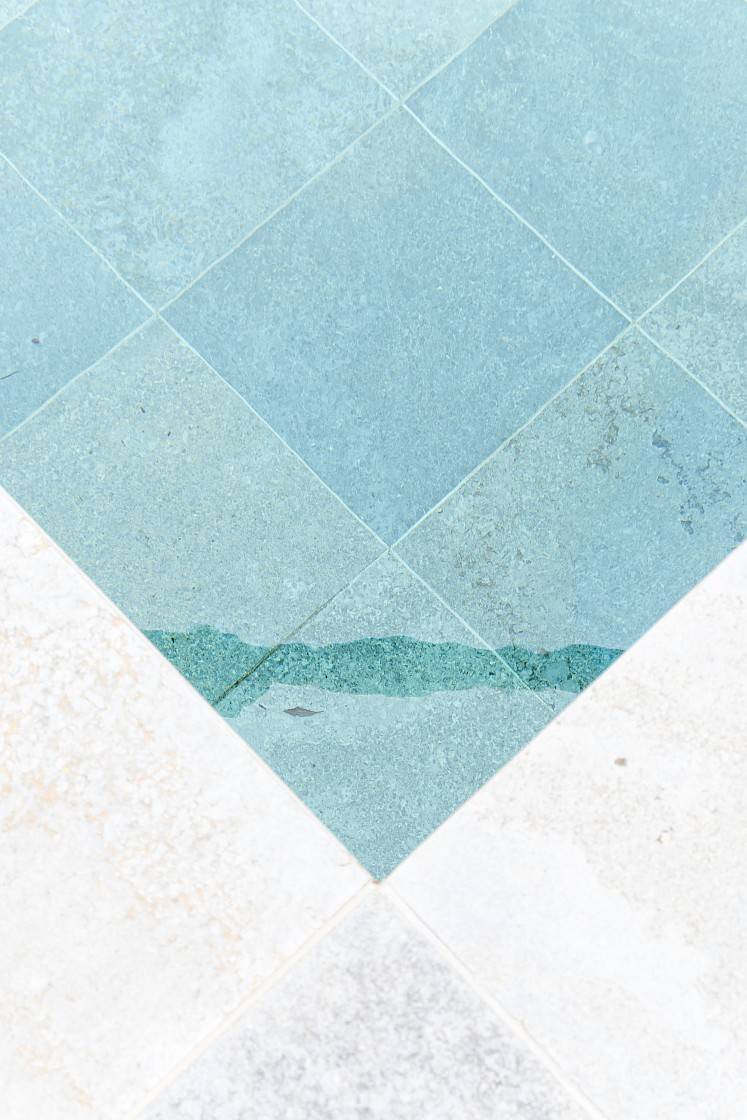 Blikvanger is het buitenzwembad dat uitgevoerd werd in muschelkalk. Dankzij een hydraulisch systeem kan dit zwembad moeiteloos getransformeerd worden tot een ruim terras – ideaal voor elk seizoen. Zowel het terras als het zwembad zelf werden volledig afgewerkt in dezelfde kalksteen, wat zorgt voor een strak, uniform geheel.