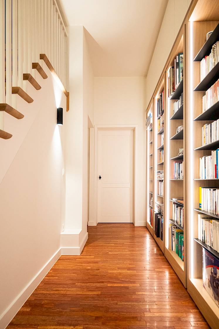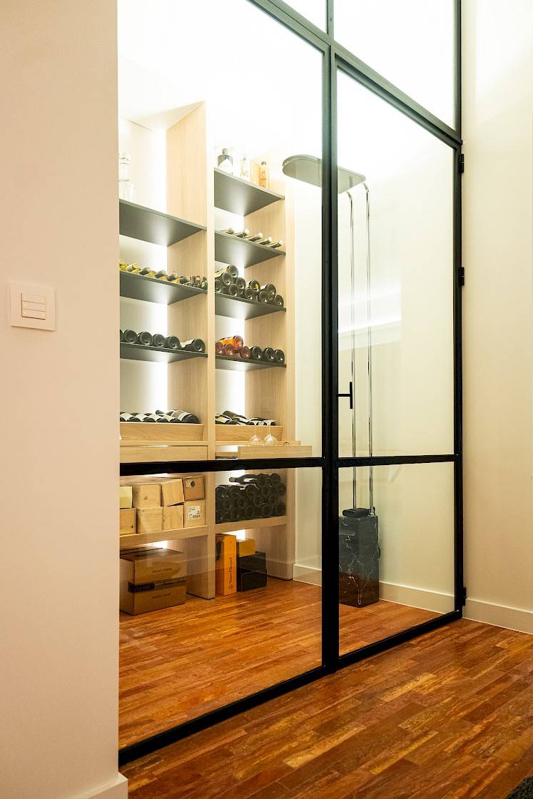 Een bijzonder element in dit project is de rode travertin ‘Rosso Persiano’, die werd toegepast in de bibliotheek, de wijnkelder en de inkomhal op het gelijkvloers. Deze natuursteen met warme schakeringen geeft de ruimtes een stijlvolle, tijdloze sfeer.