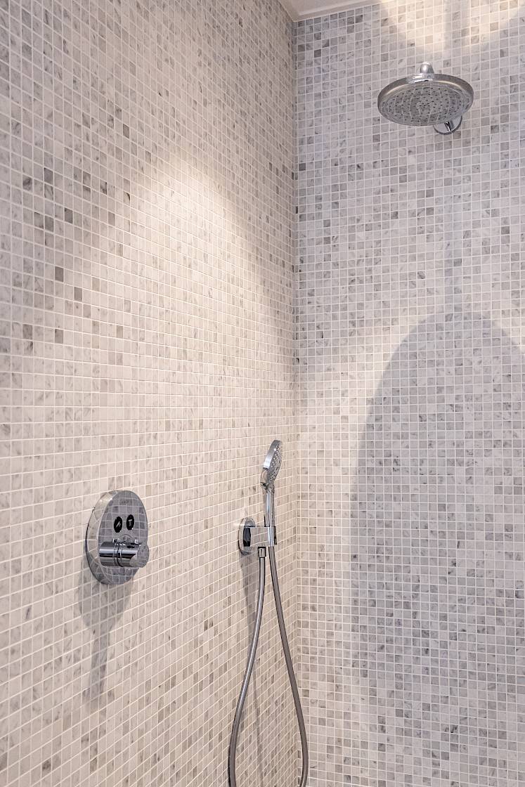 Binnenin werd elke badkamer voorzien van een eigen karakter, met gebruik van verschillende soorten mozaïek en natuursteen. We verzorgden ook de tabletten voor de badkamermeubels, perfect op maat gemaakt in bijpassend materiaal.